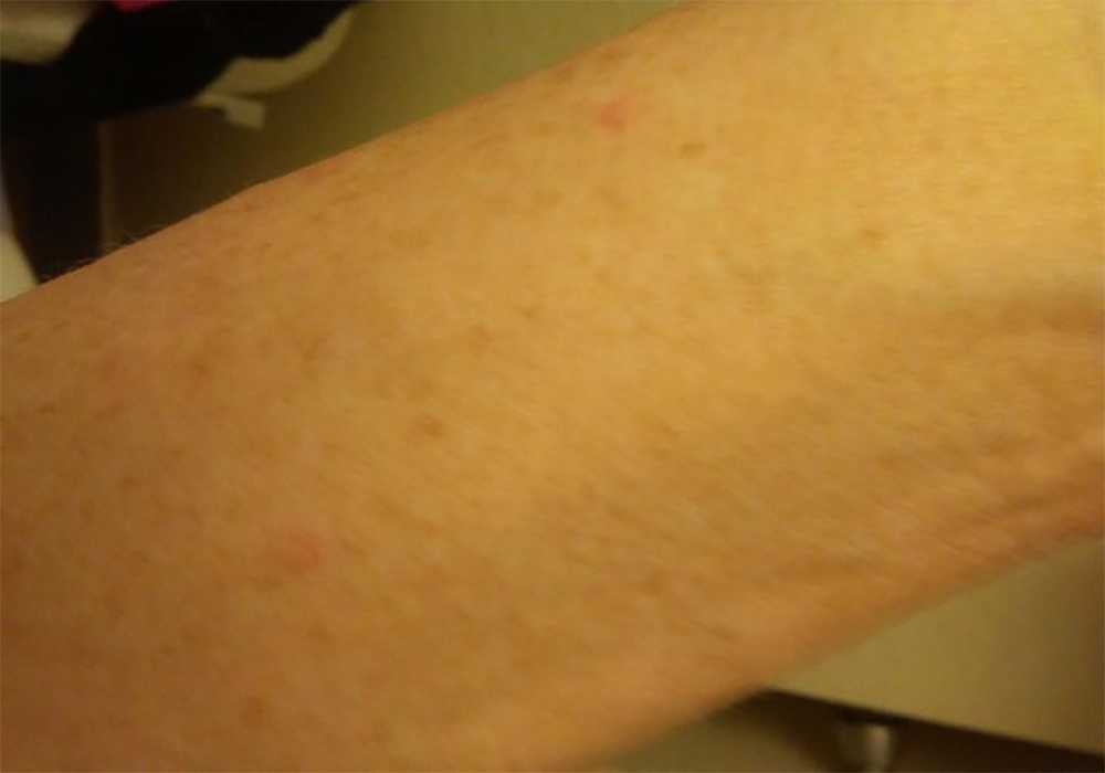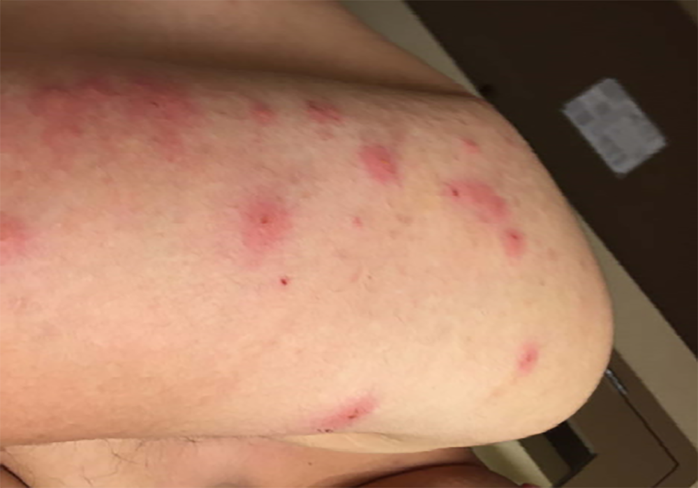 Bed bug bites often appear in clusters, straight lines, or zig-zag patterns. They are usually red, itchy, and inflamed — and tend to show up on exposed areas such as arms, legs, neck, or back. If you notice new bites after sleeping or resting in a certain location, especially when paired with stains or signs of bugs, you should assume exposure.